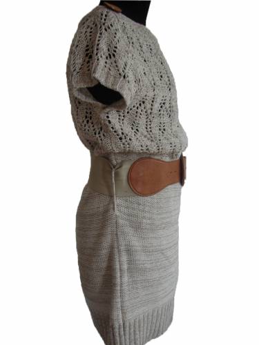 Оригинальный жилет, пояс которого, украшен широким ремнем. Приятный бежевый цвет. Размер - 14 (44/48) Ширина в плечах - 37см Обхват талии - 82см Длина изделия - 71см Состав - 56% котон |