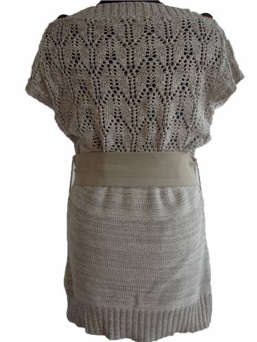 Оригинальный жилет, пояс которого, украшен широким ремнем. Приятный бежевый цвет. Размер - 14 (44/48) Ширина в плечах - 37см Обхват талии - 82см Длина изделия - 71см Состав - 56% котон |
